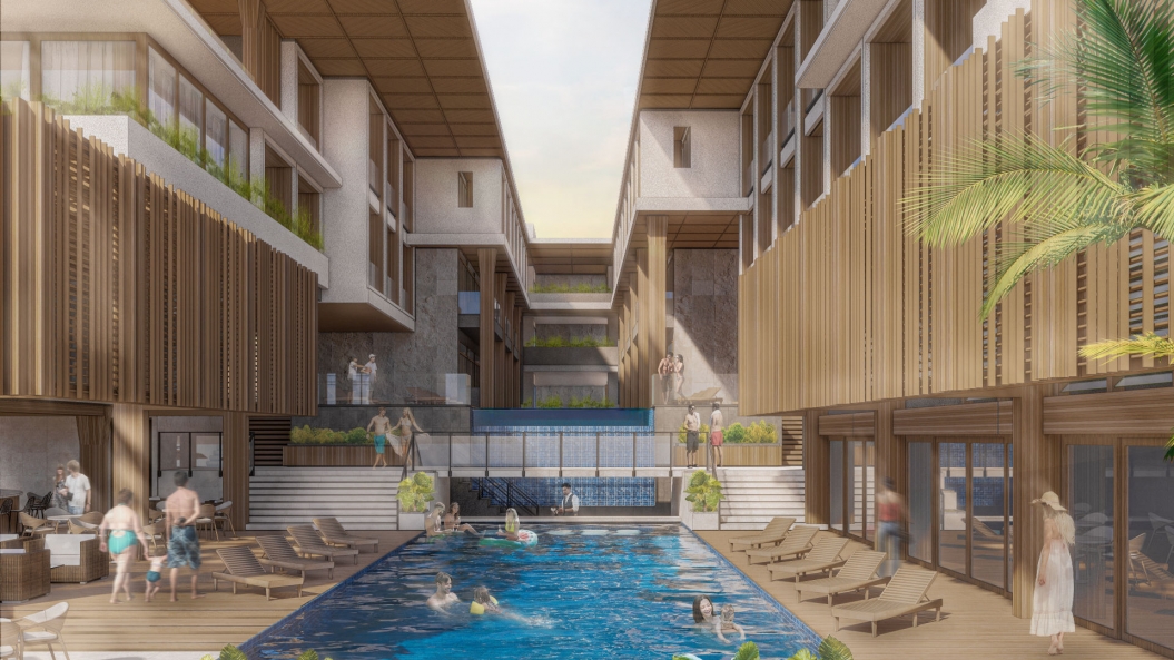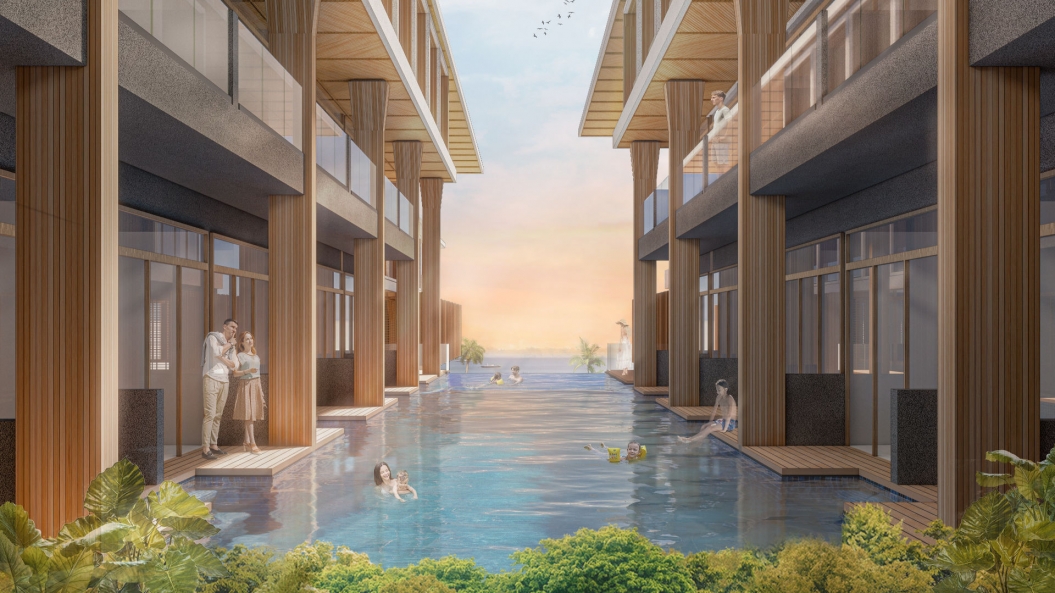 Despite being a challenging factor, the narrow width of the lot also proved to be a positive opportunity for the building’s form, which points outward towards the ocean and directs one’s attention to its breathtaking view. This allowed us to establish easier navigation where guests are immediately greeted with a vista of the ocean upon arriving at the main lobby, enhancing their experience even before they enter their rooms. Infinity pools then lead the guests from their rooms towards the beachfront.