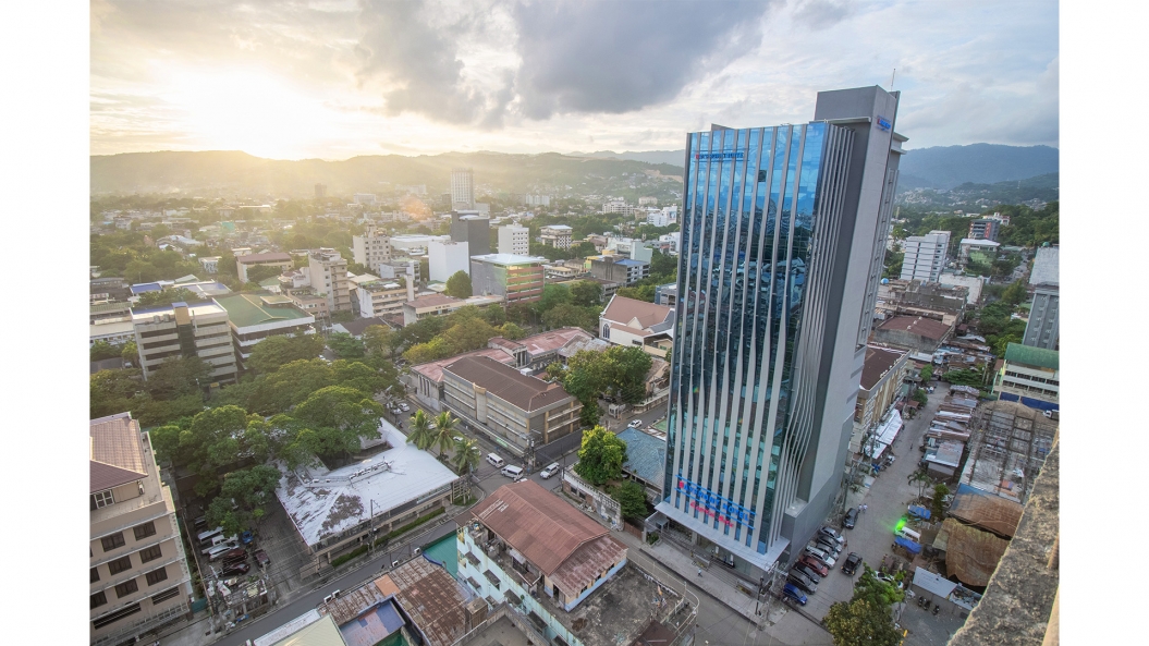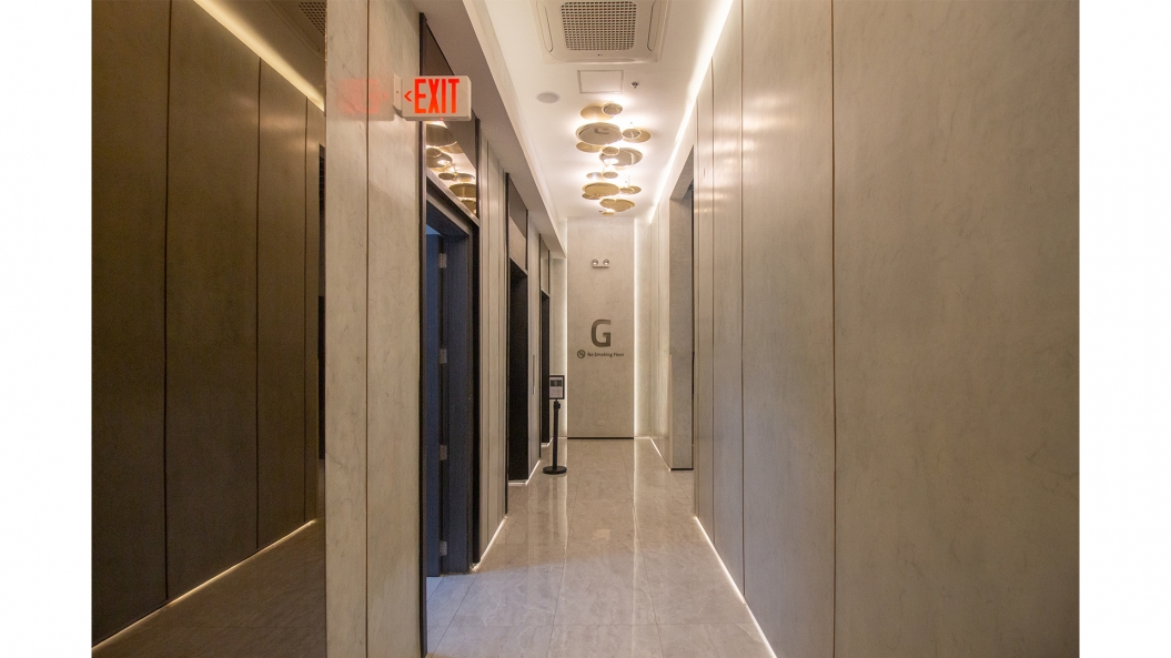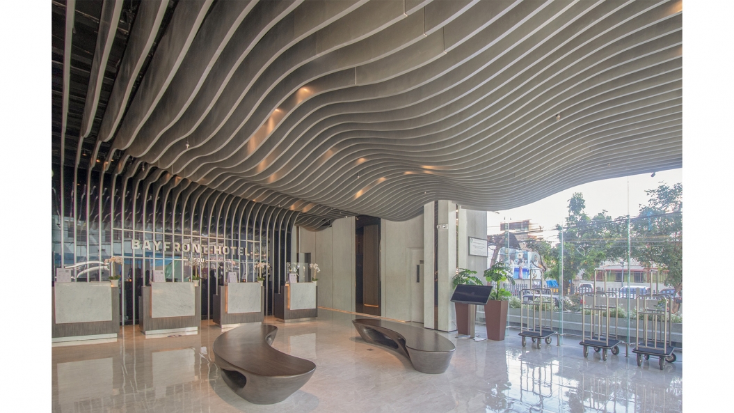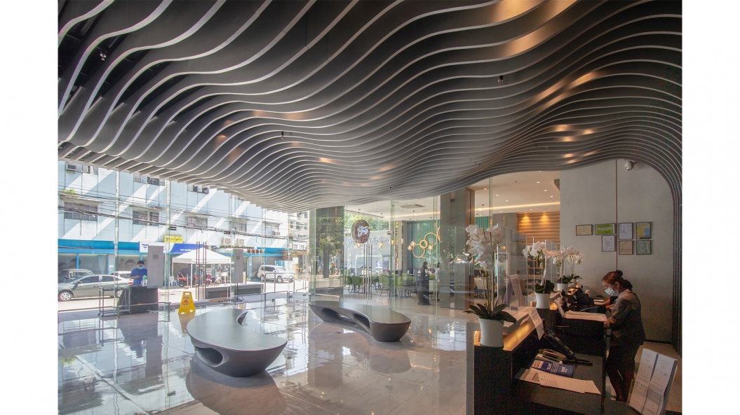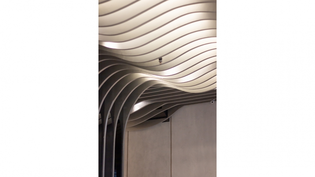 From the street, one can observe the twisting motion of the louvers which naturally brings the attention of the viewers upwards, emphasizing the height and scale of the project. The waves of the façade is carried on in the ceiling design of the lobby through the use of undulating louvers, rising and falling in an almost rhythmic pattern reminiscent of the ocean’s tides.