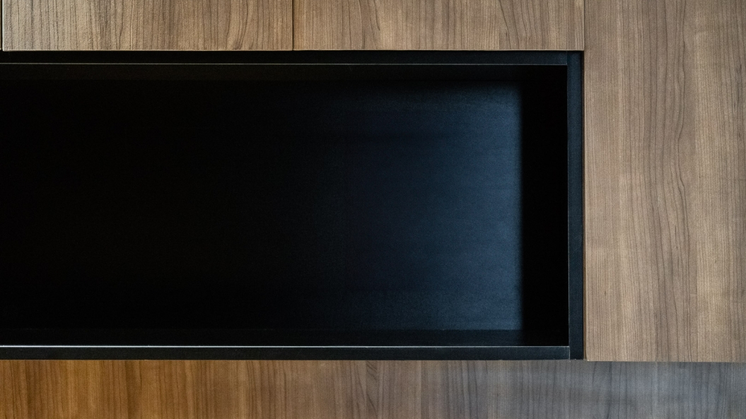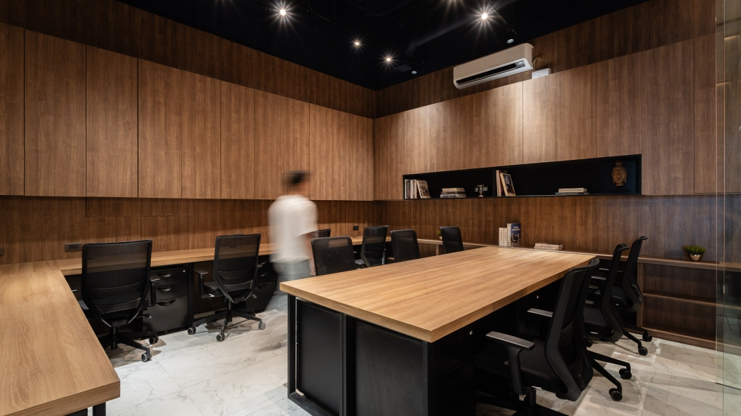 Since the office is a penthouse unit, we wanted to take advantage of its high ceiling by exposing the structural beams that cross the space diagonally. The 5-meter-high ceiling allows the space to breathe and remove any feeling of stuffiness for the staff which is common in compact office spaces. Referencing the company’s original brand color, the exposed ceiling is painted with a subtle deep blue and matched with sleek custom-built oblong lights  that evenly distribute light to all the workstations.