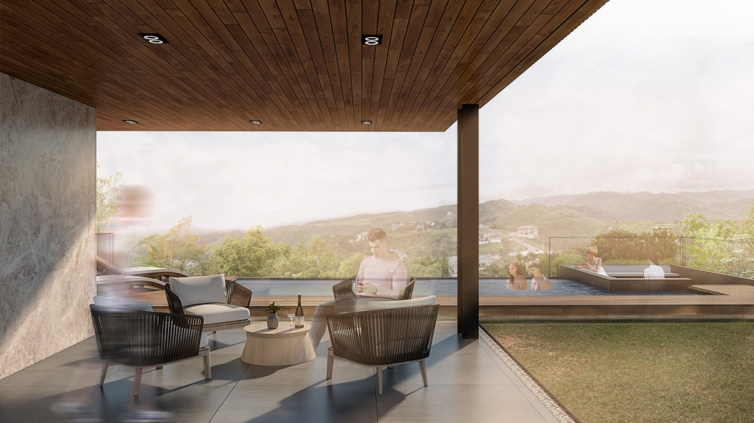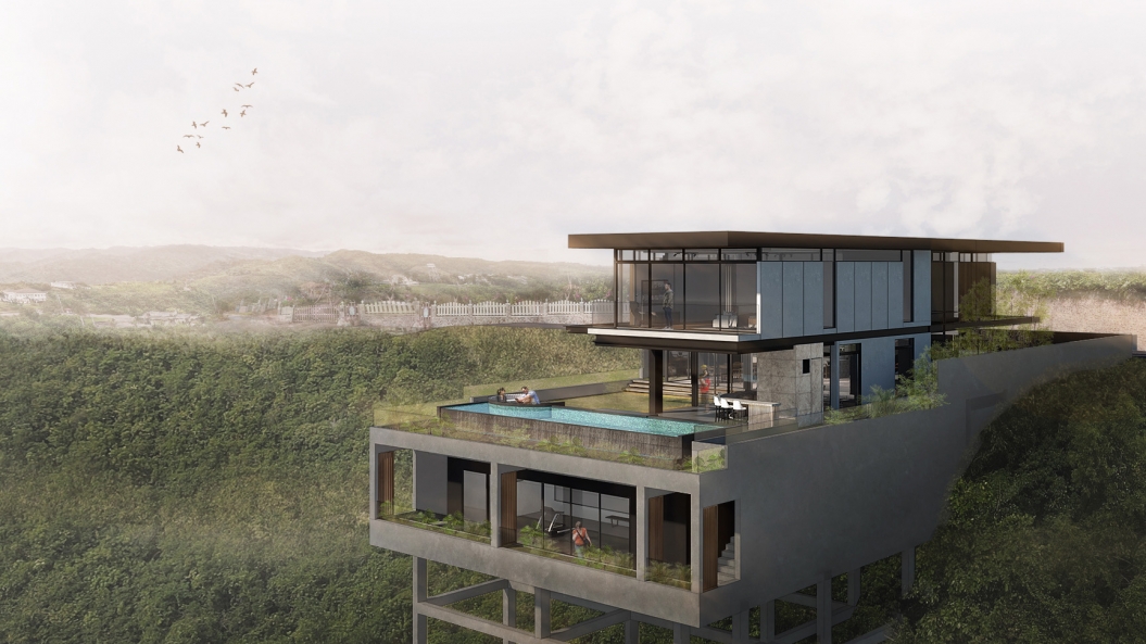 The main living spaces arranged in an open plan are concentrated towards the back of the site simply to maximize the views the site has to offer. Blending the outdoors and indoors, the dining and living areas spill out into the lanai and garden, creating a perfect area for hosting parties and events. The infinity pool lined with vegetation rests at the edge of the property, a lush foreground against the backdrop of the Cebuano landscape.