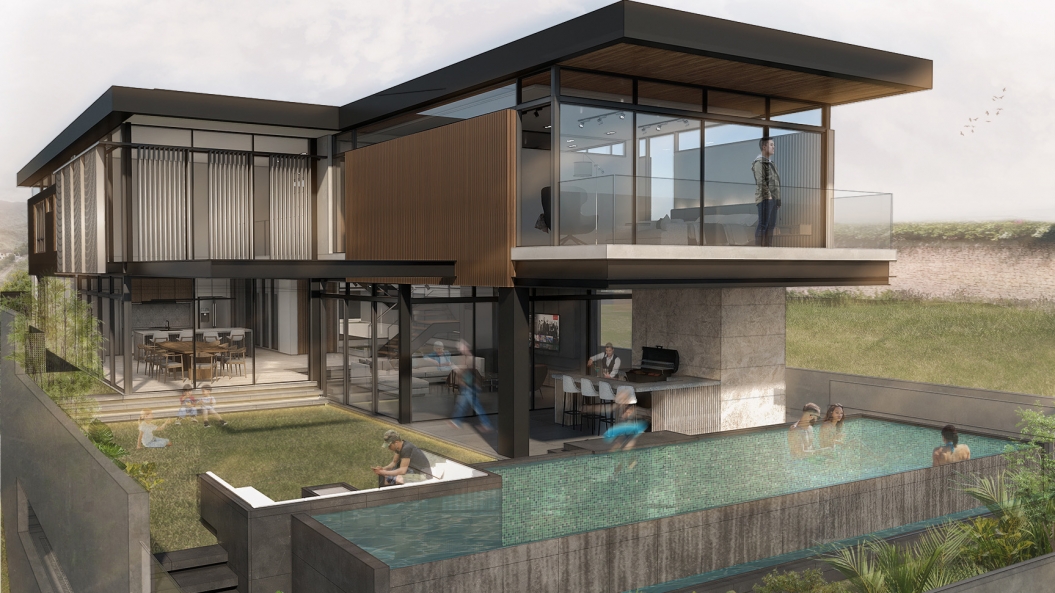 From the drop-off, one is welcomed by a long, narrow walkway that leads toward the main entrance door. The approach is almost processional as the architecture slowly compresses one through this stretch. As soon as one steps foot inside the foyer, an explosion of light releases the tension and a grand double-height living room comes into view. And one can do little else but gaze in wonder at the space before them, the garden, and the views beyond.