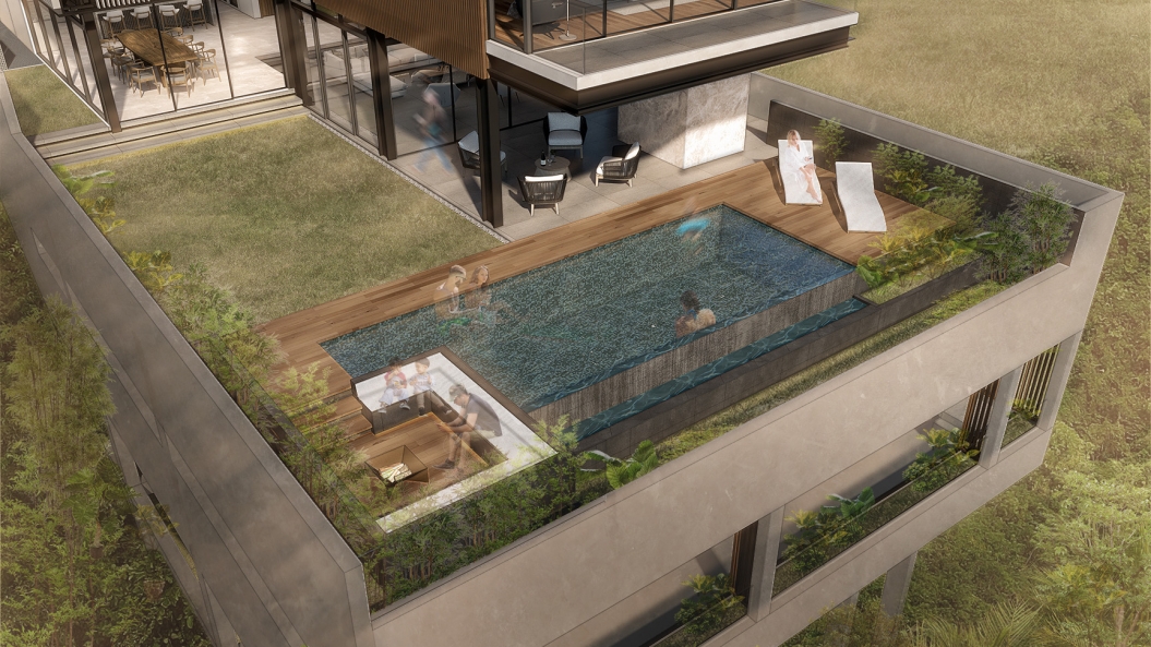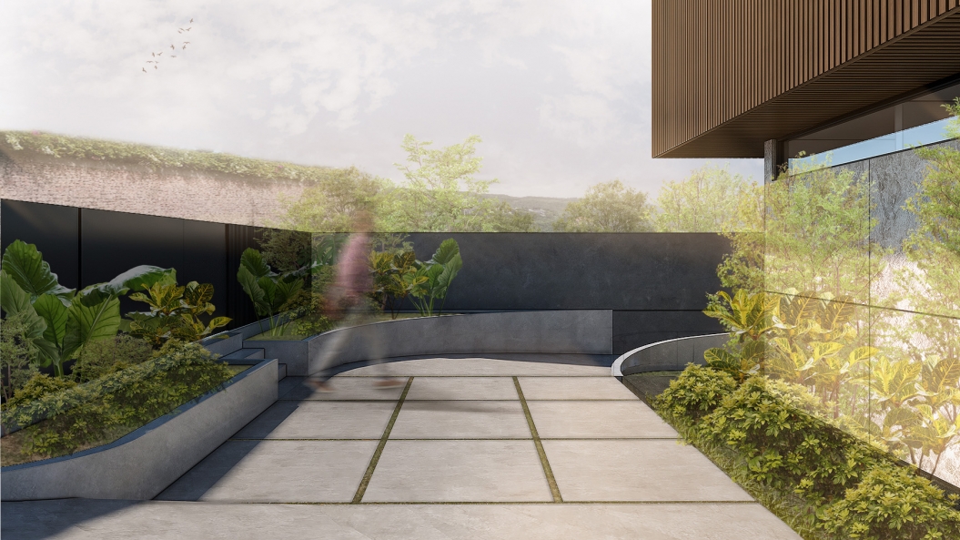 Faced with the challenge of having only a 6-meter building height limit, there was no other option but to build downwards in this sloping site. A floating rectangular volume occupies the frontage, commanding the attention of each passerby yet unrevealing of the spaces that lie within. Dark horizontal steel members and slender wooden fluted panels create a façade that is bold and imposing yet evokes the subtle warmth of a good family home.