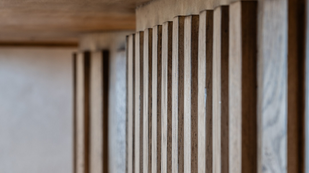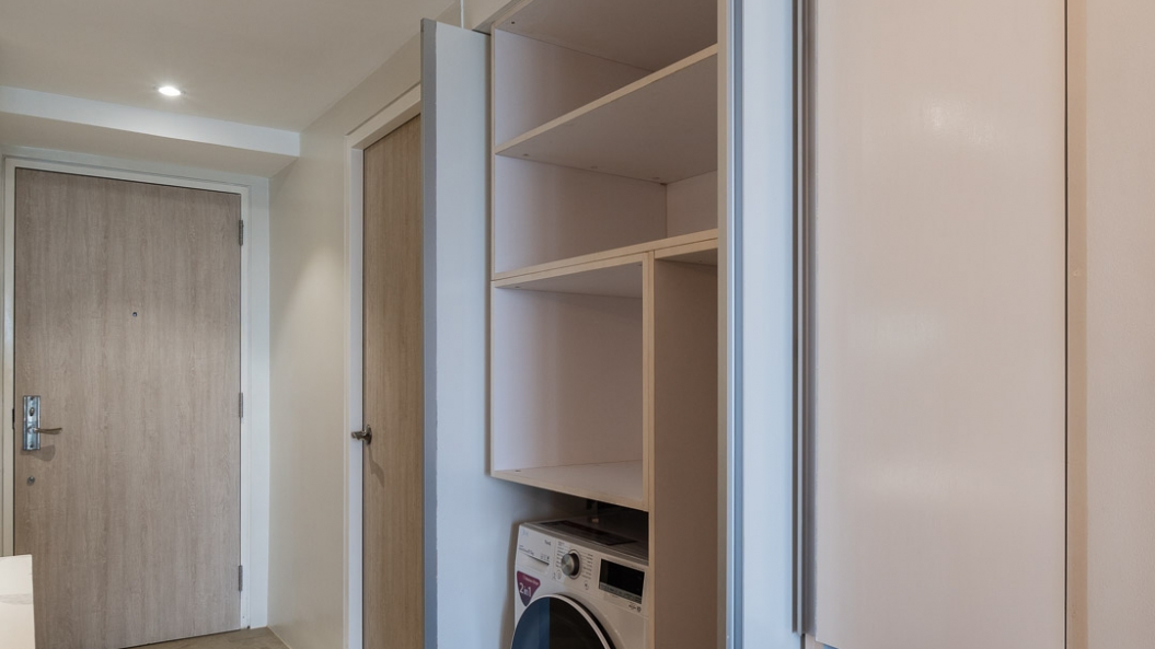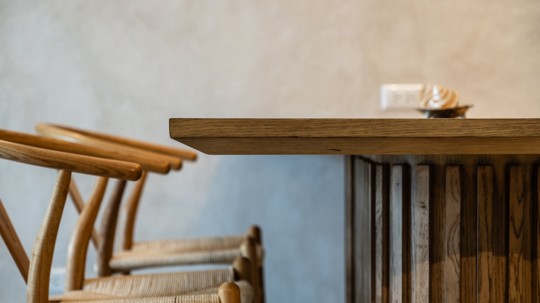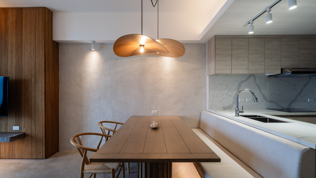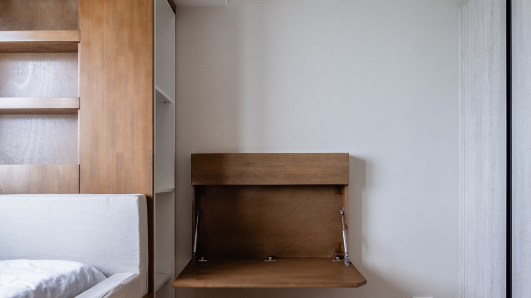 Space-saving solutions and smart furniture elevate the user experience by hiding the clutter and creating more room for movement. These storage units are discreetly concealed in key areas such as under the dining bench and inside the bedframe. A foldaway table at one of the bedrooms serves as an extra working surface that disappears into the wall when not in use.