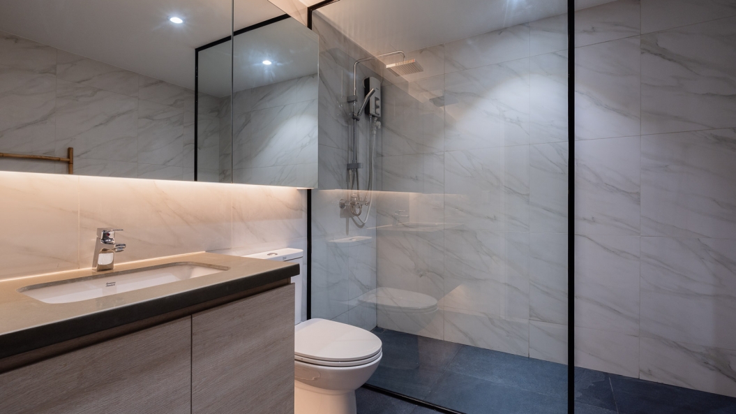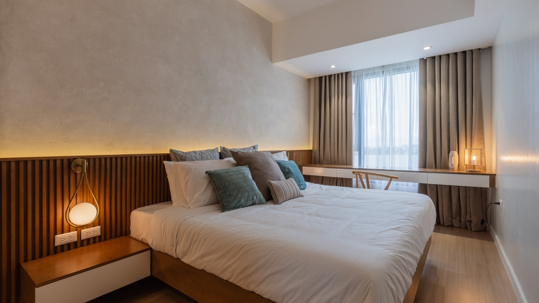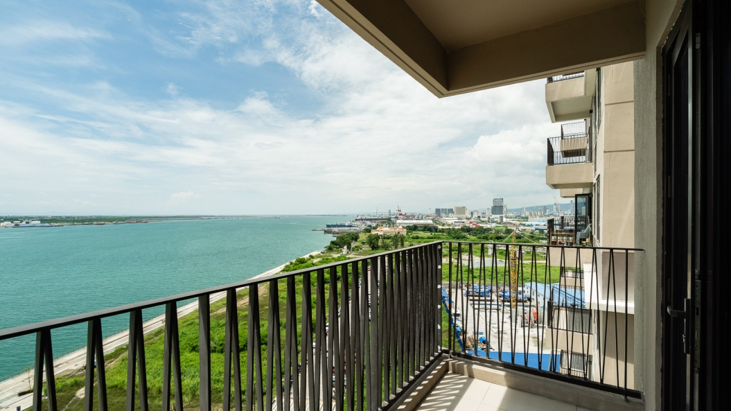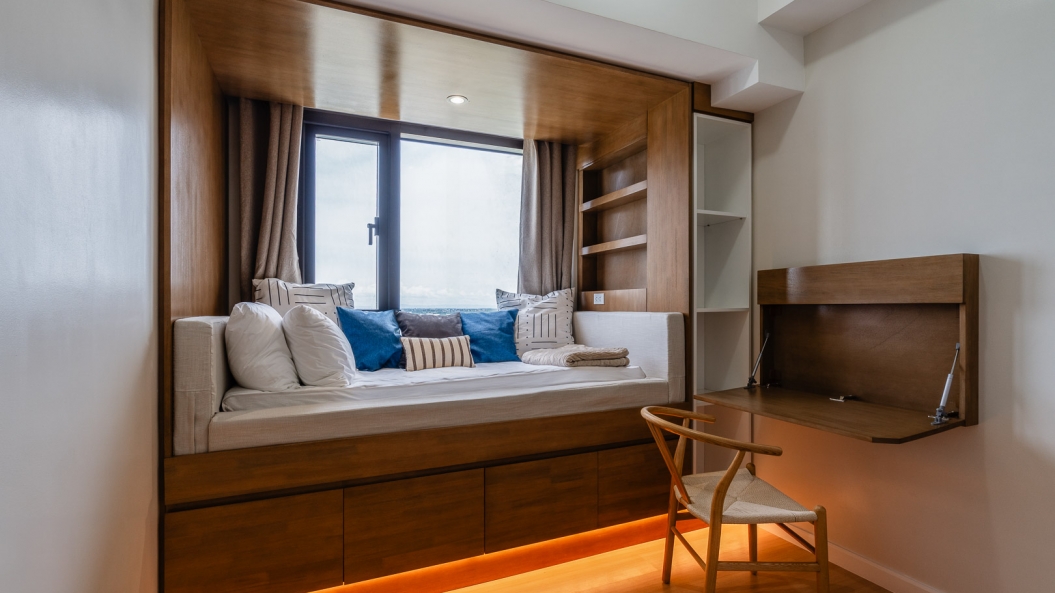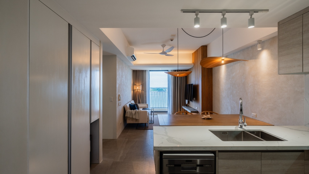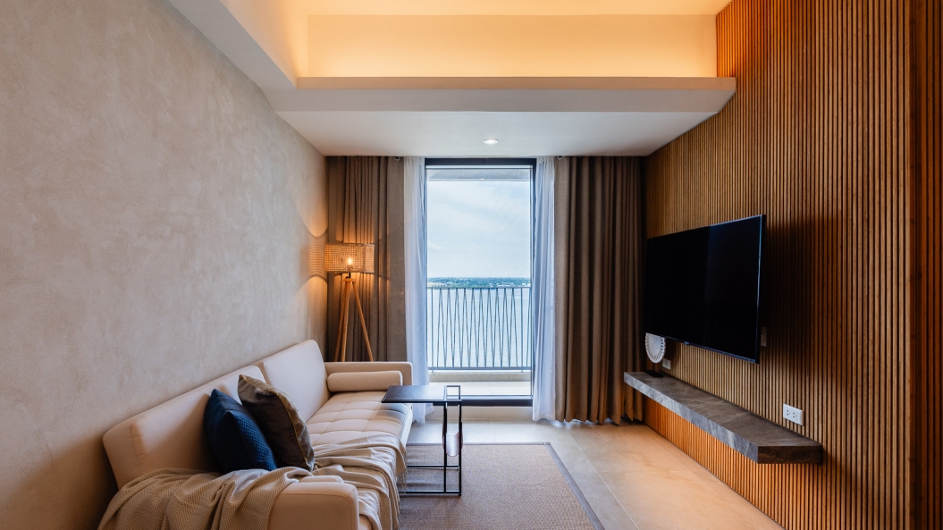 Amidst muted tones of cream and wood are splashes of ocean blue accents that liven up each space. The full-length sliding doors leading to the balcony allows sunlight inside, casting a warm, tropical glow in the living room as one gazes upon a picturesque sea view.
