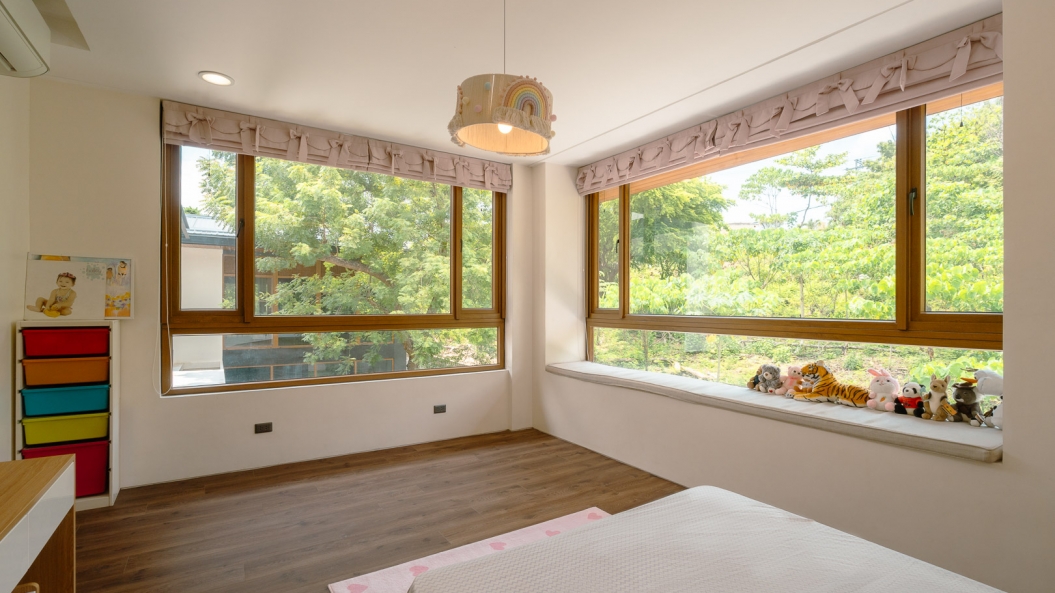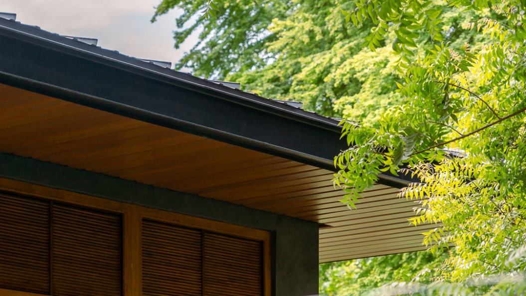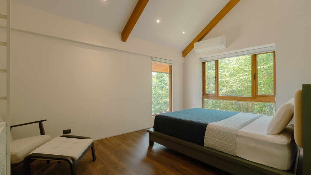 The steep roof pitch and exaggerated horizontality of the entire structure create the impression of a non-intimidating, low-lying home. Lastly, the restrained approach to the design and strategic use of materials allows the owner to build his dream home without needing an excessive budget.