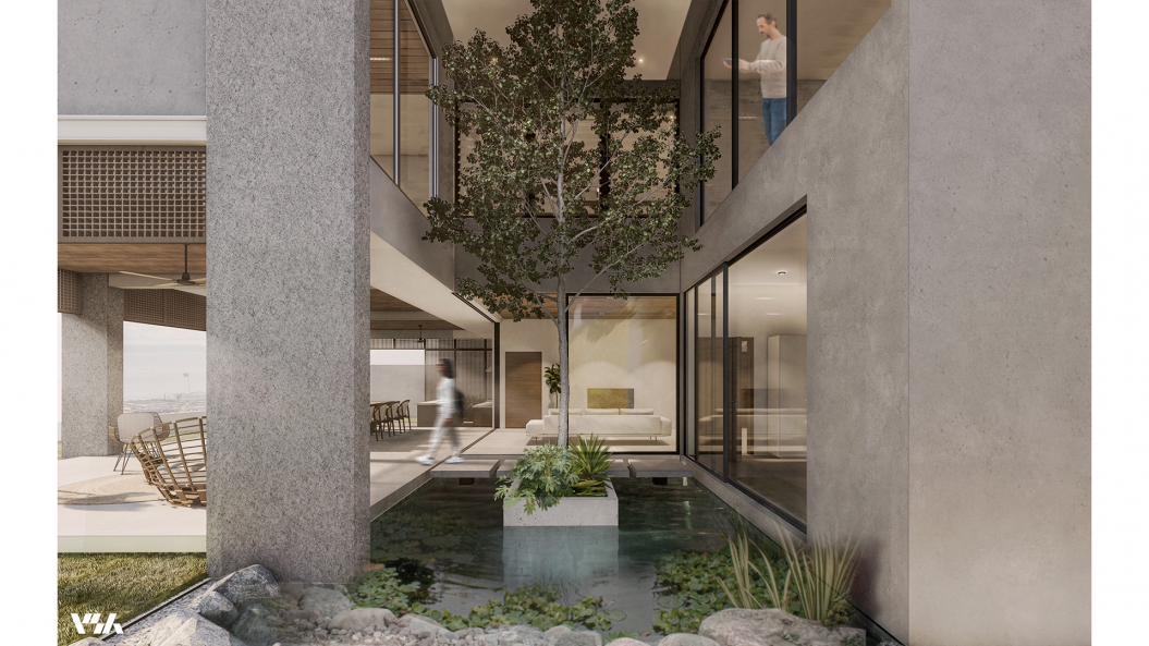 A spacious receiving area, bordered by a double-height interior courtyard, ushers you inside. Beyond this space, you are offered a glimpse of the entire first floor, which is a recreational zone dedicated to hosting parties and entertaining guests. To your left, nestled below a screened skylight, golden rays of sunlight filter into the vast main courtyard that occupies nearly a third of the house’s floor area. A staircase pulls you in that direction and leads you down a couple of floors, past the bedrooms, and towards the lanai, where a second courtyard comes into view. A solitary tree sitting in the middle of a koi pond sets the scene, as your eyes travel toward the magnificent scenery beyond.